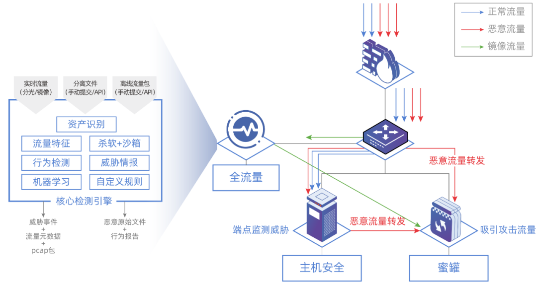 在攻防演练场景中,全流量分析、蜜罐和主机安全产品在常见攻击路径的关键节点上均能发挥重要作用,若三者能够联动打,可以实现“蜜-网-端”全面监测。