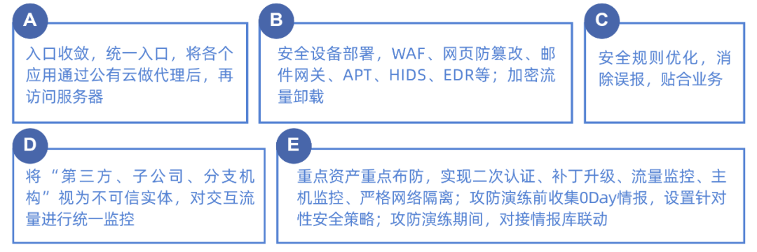因此,在攻防演练场景下,建议将边界的防护范围扩大,从以下方向逐一优化,筑牢边界防御体系。
