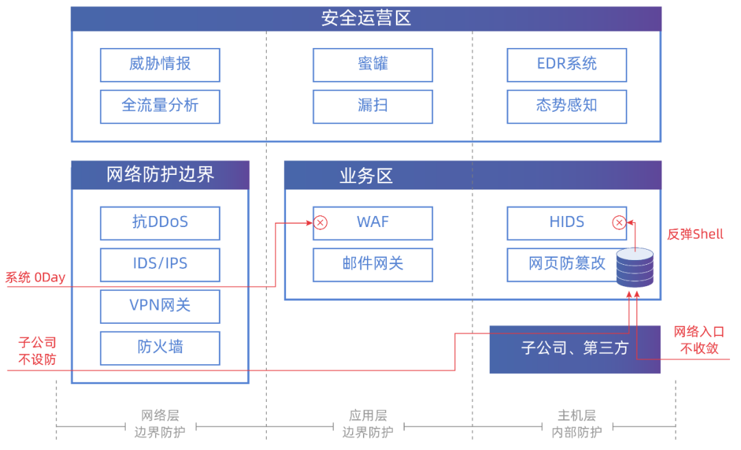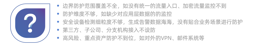 边界防护是重中之重!总结多年的大型攻防演练攻防经验,我们发现对边界防护的绕过仍大比例存在,同时发现很多防守单位往往只将边界划分在企业网络出入口的范围,向内对通信协议的不同层级没有对应的防护手段,向外对第三方、分子公司没有有效的管控措施,将所有的问题总结如下:
