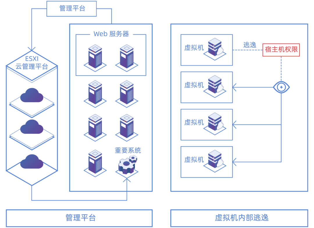 在以往的安全观念中,攻击者如需从外网突破,势必要经历初始入侵、维持权限、信息搜集、横向提权的多个循环,直至最后获得服务器的管理员权限。因此有效的防守策略就是在这条路径上部署众多阻断、诱骗工具,以拖延攻击进程,完成溯源反制。虚拟化技术的引入改变了这种格局,它为攻击者打开了新的入侵路径: