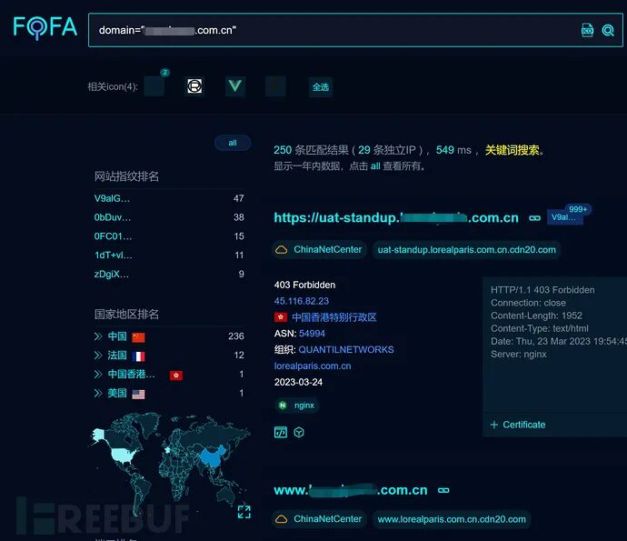 那就收集旁站和子域名,可以使用工具像Layer,也可以用黑暗引擎像FOFA,SHODAN,笔者这里就用了FOFA收集: