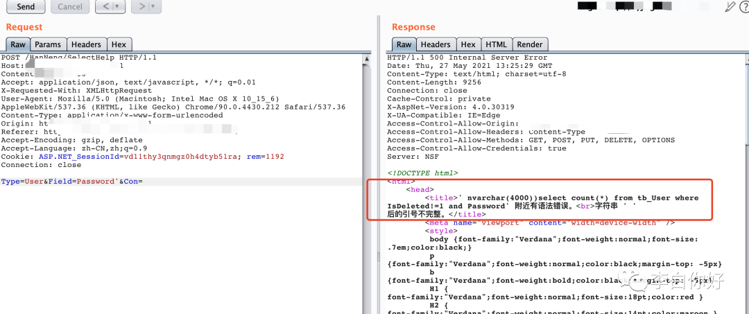 经过测试发现该处不仅存在未授权访问,Field参数还存在注入。select count(*) from tb_User where IsDeleted!=1 and Password'