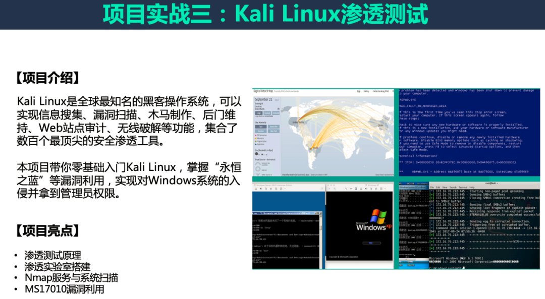 本安全体验营涵盖网络安全入门指南、安全等保2.0、Kali Linux渗透测试、互联网业务安全实战、情报搜集与反诈骗实战等多个热门前沿安全专题。这门课以实战驱动学习,充分调动同学们的兴趣及动手能力,为的是培养实战型的攻防兼备网安人才,帮助你科学体系化地学习前沿安全技能,了解安全行业。![]()