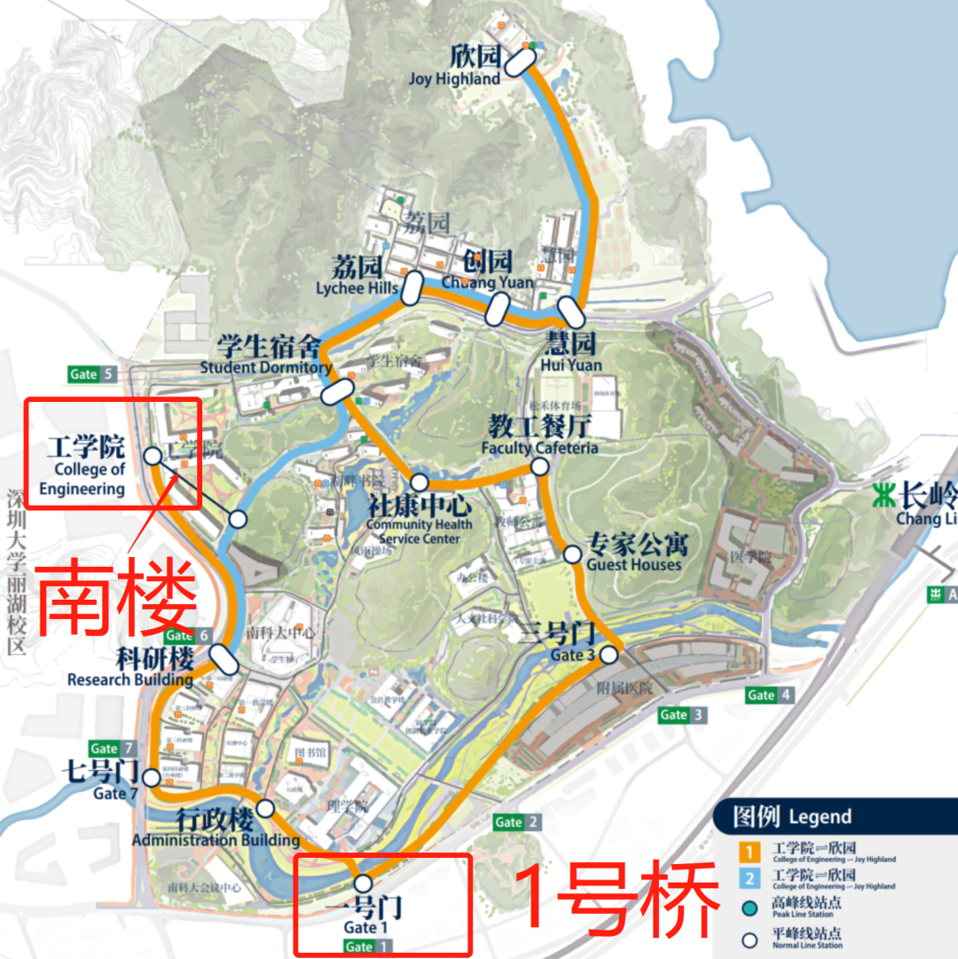 可导航至南方科技大学1号门、7号门、6号门、3号门进校,进校后可乘坐校园巴士1号线(工学院方向)。