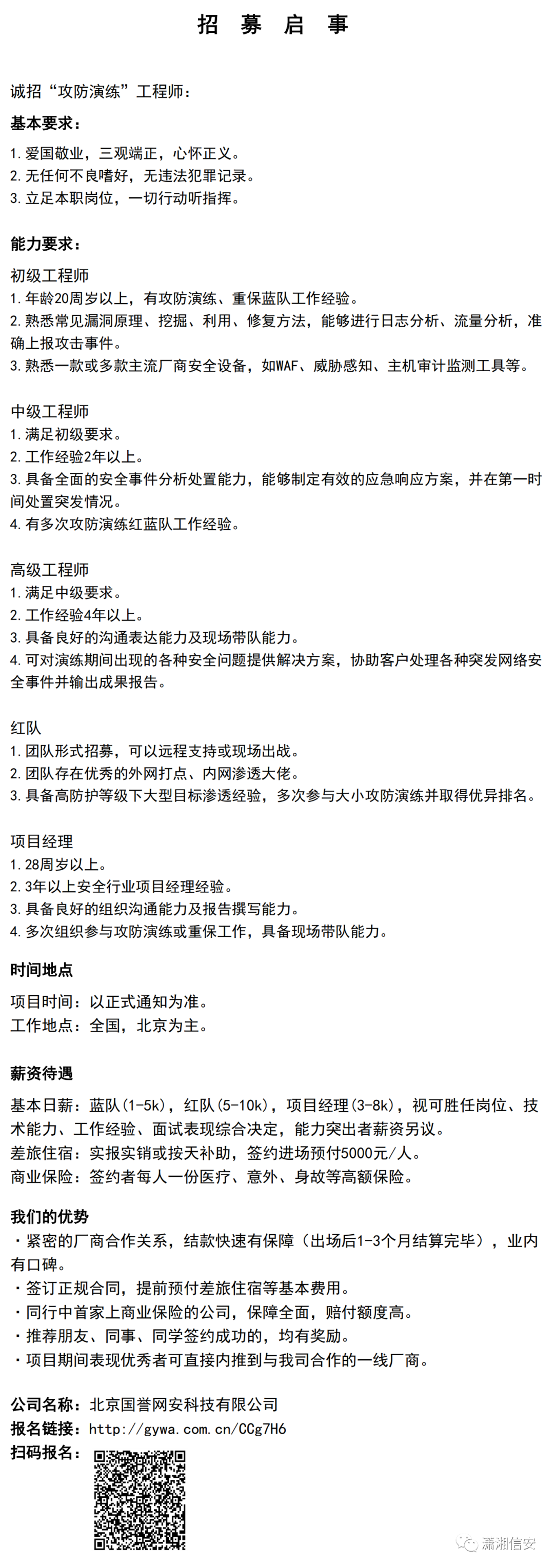2023年HW收简历了,预计6-7月份开始,去年合作过的一家公司,有想法的师傅可以投简历试试。报名链接:http://gywa.com.cn/CCg7H6