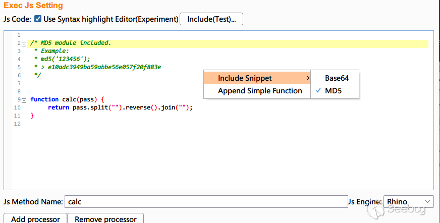 ExecJS选项卡,像常见编程语言一样,你需要编写一个入口函数。不过不同于其他编程语言的入口函数,插件将会把待处理/加密的内容传递给入口函数的第一个参数,而你编写的入口函数则需要在处理结束后返回处理结果。Append Simple Function,即可生成一个空函数calc,并自动在下面的入口函数名填写入口函数为calc。function calc(pass) {