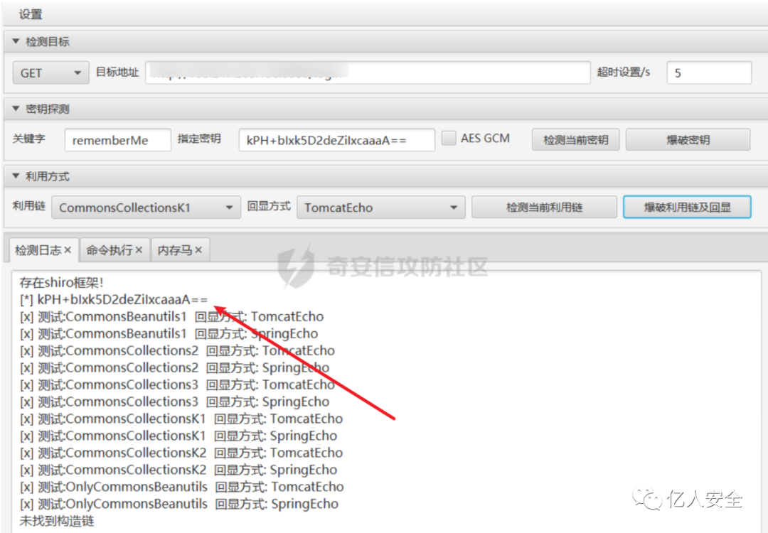 直接使用shiro_attack_2.2工具开冲,发现有默认key但是无利用链