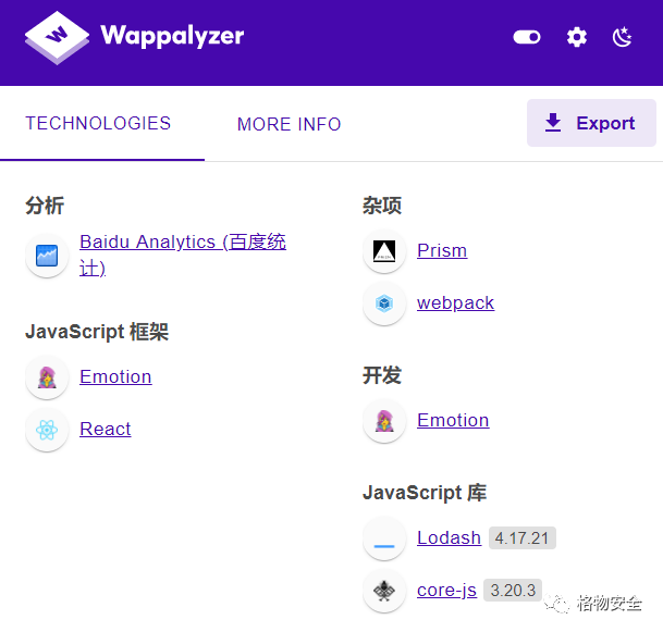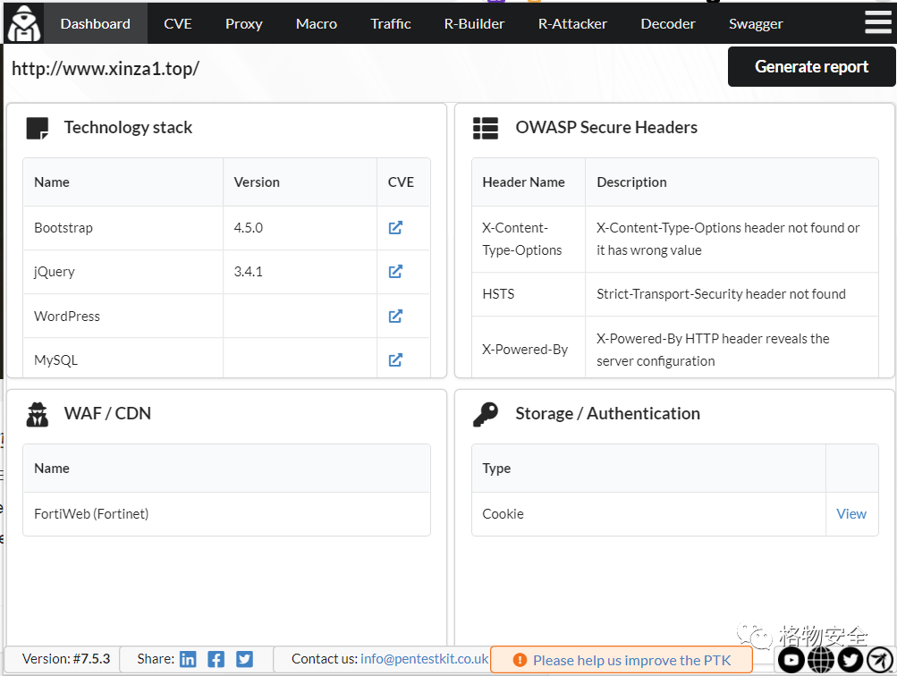 PTK仪表盘允许您分析客户端/服务器端技术并检查任何第三方库以获取现有的CVE,例如已知的漏洞。同时,它使您可以在浏览应用程序时快速访问有关所有框架和请求的信息。