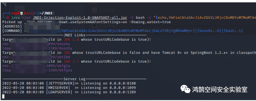注:1.漏洞利用工具JNDI-Injection-Exploit-1.0-SNAPSHOT-all.jar只能是在你的攻击机里,不能使用kali生成vps ip地址的payload然后用vps监听