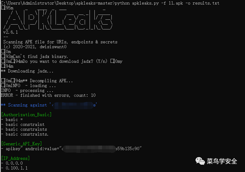 -o, --output | 导出文件结果 | apkleaks -f file.apk -o results.txt |