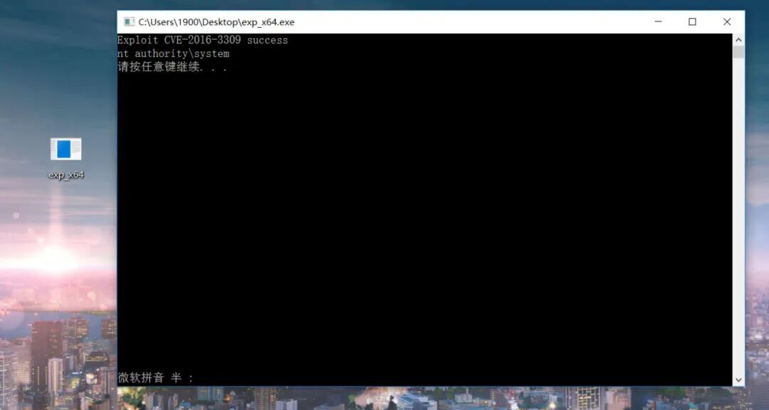 完整的exp地址保存在:https://github.com/LegendSaber/exp_x64/blob/master/exp_x64/CVE-2016-3309.cpp。运行程序,可以看到提权成功: