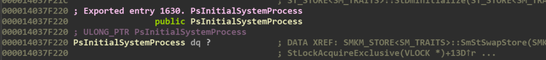 想要实现提权就要将System进程的Token赋值给本进程的Token,在ntoskrnl.exe内核文件中,全局变量PsInitialSystemProcess保存了System进程EPROCESS地址: