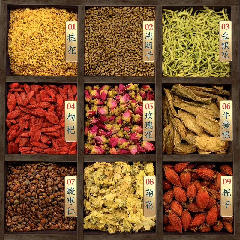 决明子、栀子、枸杞是清热解火、养肝明目的成分,菊花、玫瑰、金银花、桂花能舒肝,牛蒡根养肝,酸枣仁则负责平肝理气和安神。