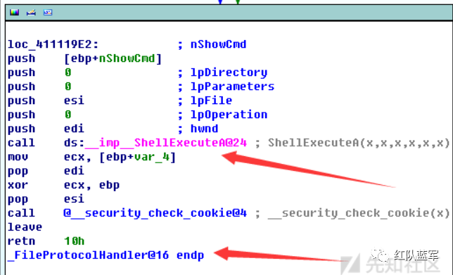 导出函数FileProtocolHandler同样调用API ShellExecute,如下图