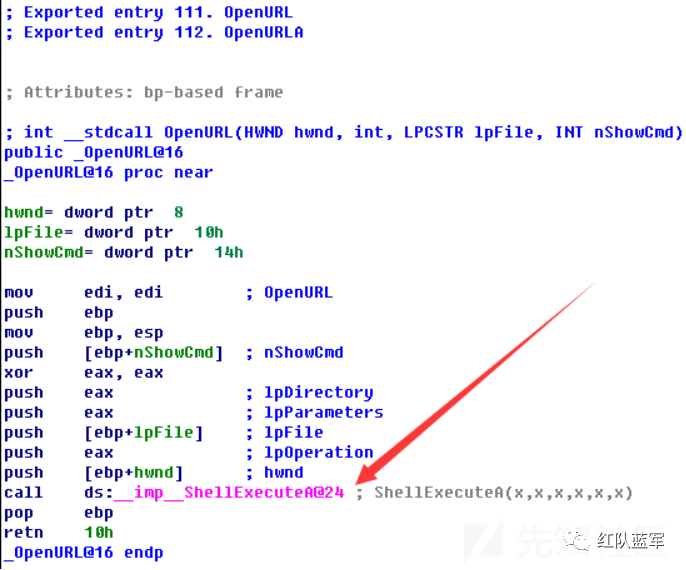 使用IDA查看url.dll的导出函数OpenURL,其中调用了API ShellExecute,如下图