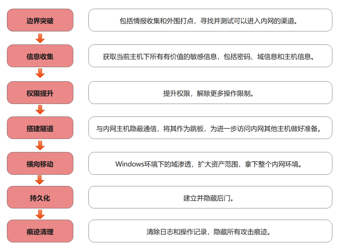渗透测试的目标可以是单个主机,也可以是整个内网。在实战中,比如最近如火如荼的HW行动,更多的是对一个目标的内网进行渗透,争取获得所有有价值的资产。完整的内网渗透涉及的步骤如下图所示。我们总是先通过对外提供服务的,防守最薄弱的主机打进去,然后搭建隧道,通过该主机访问内部的其他主机。快速横向移动到到内网中的核心资产,获取核心敏感数据和权限,完成一次疼痛的打击。