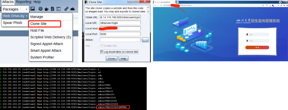 值得一提的是,CS具有一键克隆钓鱼网站的功能,配合环境和话术,目标很容易上钩。