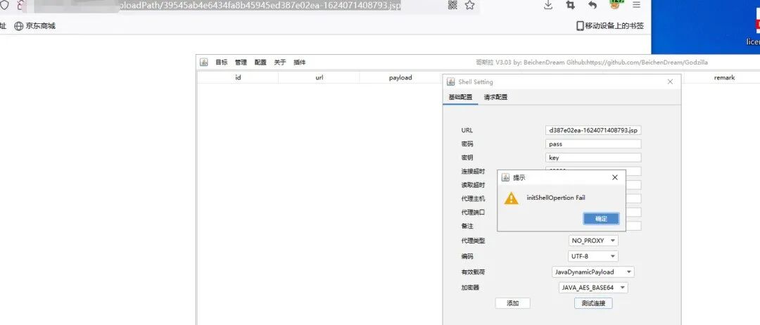 上传完毕后,访问目标url,webshell存在,但是利用Godzilla直接连接会失败