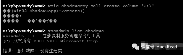 CobaltZirs0n大师尝试利用卷影拷贝方式获取目标SYSTEM,SECURITY,SAM文件本地离线解密,但是运行wmic shadowcopy call create Volume='C:\' 命令后,利用vssadmin list shadows查询时,爆出错误,提示没有注册类