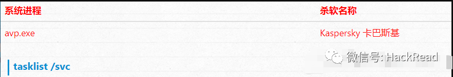 通过tasklist查看进程加杀软比对,发现目标主机存在卡巴斯基(进程为avp.exe)