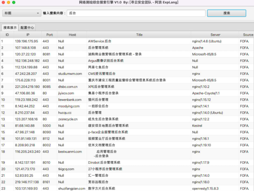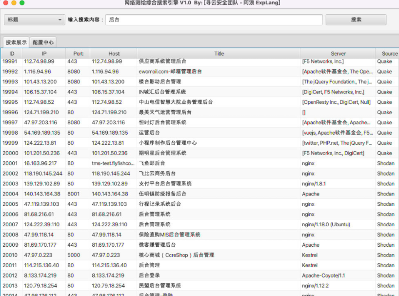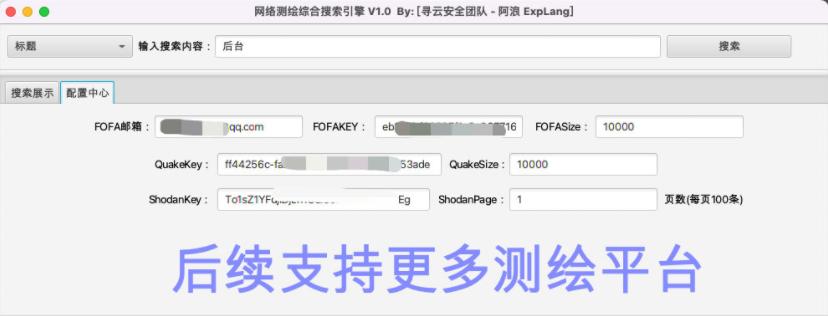 工具介绍为了方便安全从业人员在使用网络测绘平台进行信息搜集时的效率,本程序集合了多个网络测绘平台,可以快速在多个网络测绘平台搜索信息并且合并展示及导出。 安装与使用1、多平台搜索标题信息2、配置中心下