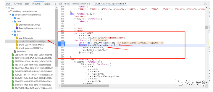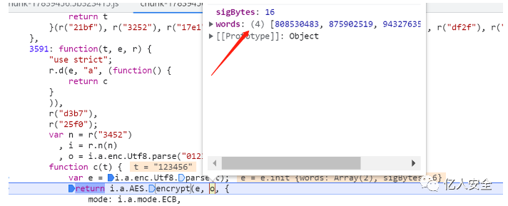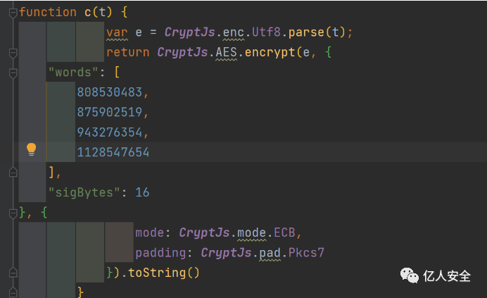 这里可以看到使用的是AES的ECB模式加密(这可以使用python的Crypto-js库来写加解密脚本或者从前端提取出js进行逆向,因为该库中有c(t)函数中所调用的enc,AES方法)