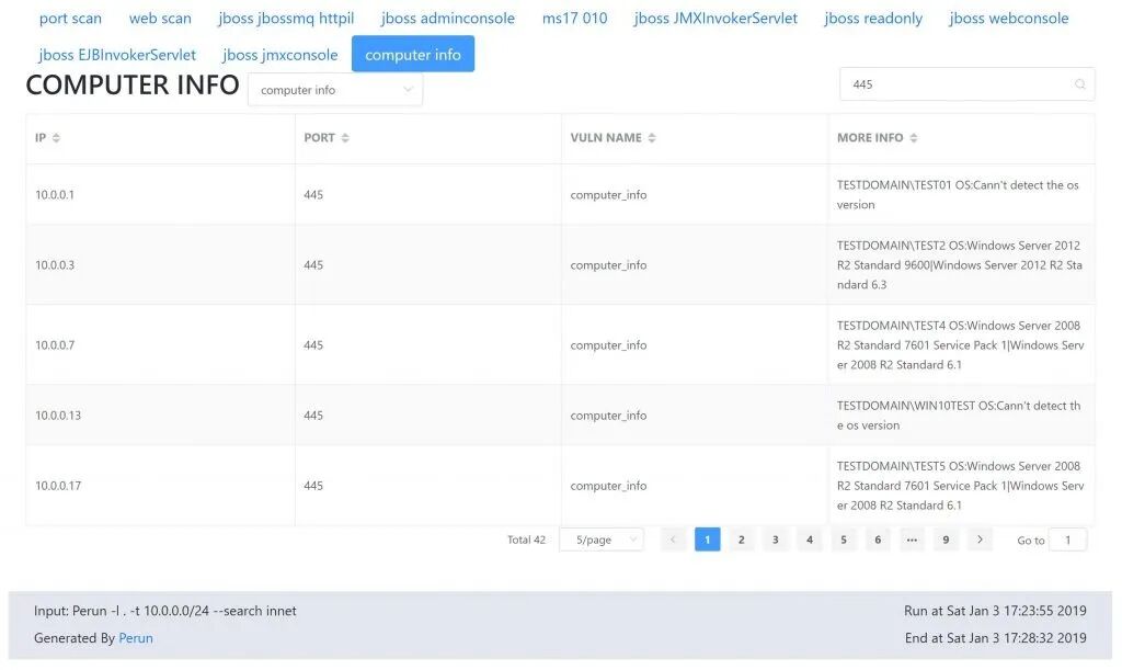 Perun由Python2.7和Python标准库开发,所有功能(端口扫描,漏洞检测,控制台输出,生成Html报告)兼容Windows系统和*nix系统,Html报告采用Vue+Element,支持对扫描结果的排序、搜索、分页。