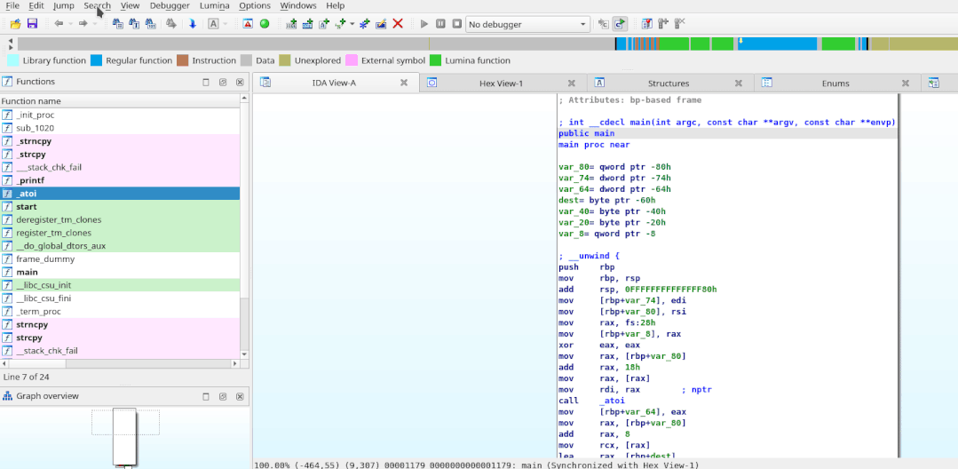 每当您想检查检测到的可能存在漏洞的函数的实例时,只需双击所需行中的任意位置,IDA 就会将您带到被识别为可能感兴趣的内存位置。