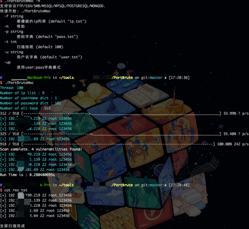 1、ip.txt中放入需要爆破的ip+端口,比如 10.10.10.10:3306。如果不是标准端口,比如3307是MYSQL。写成 10.10.10.10:3307|MYSQL。其他FTP/SSH/SMB/MSSQL/MYSQL/POSTGRESQL/MONGOD同理