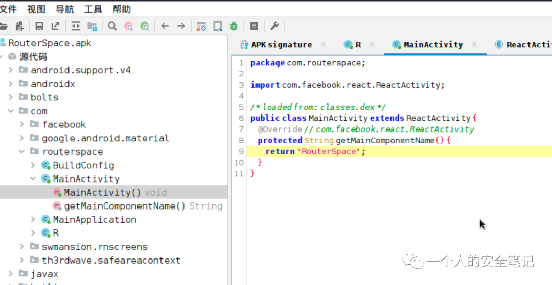 首选关注的就是 AndroidManifest.xml 文件,按开发标注每一个 Activity 都需要在这个文件里面注册,可以设置默认启动的 Activity、权限等等。可以看到这里是 MainActivity。