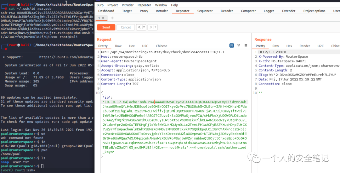 接下来就简单了,通过命令执行将本地的 ssh 公钥写入 authorized_keys 文件,成功完成 ssh 登录。