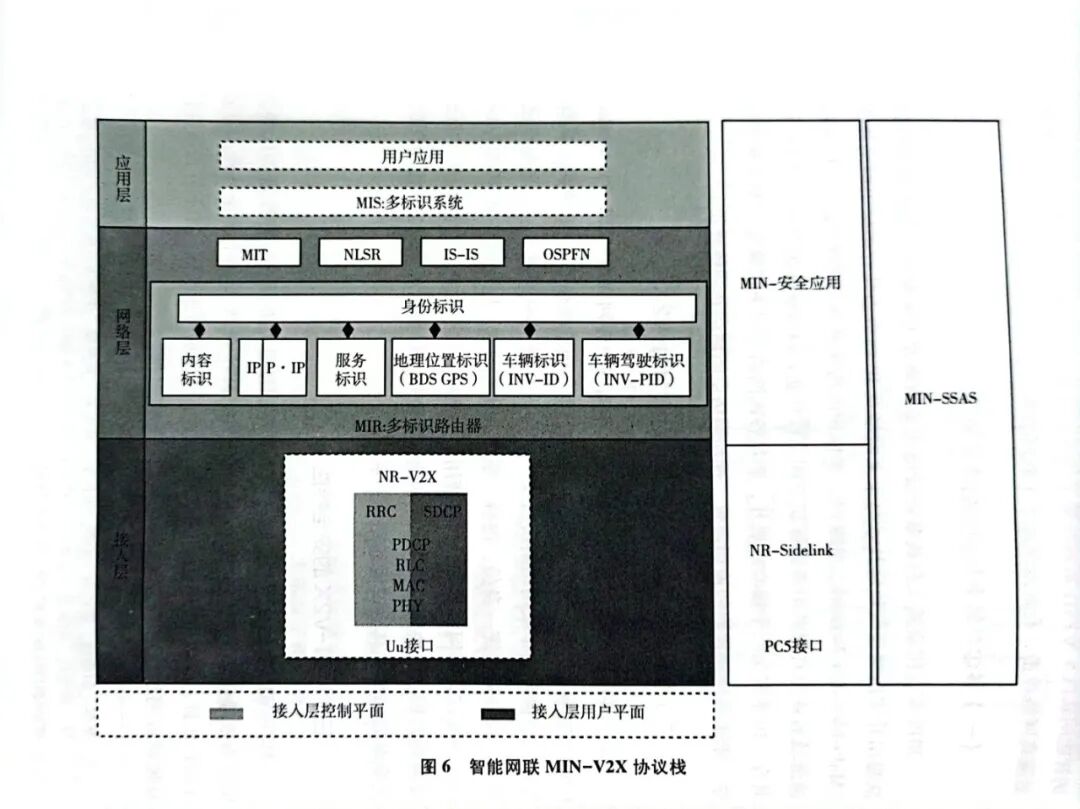 基于多标识网络MIN的智能网联汽车高安全专网MIN-V2X(Vehicular to Everything,V2X)是我国自主研制的、不依赖于现有TCP/IP协议,具有原生安全保障的车联网络解决方案。MIN-V2X支持全域覆盖的卫星与车之间的通信,通过统一身份、内容、服务、北斗地空,同时兼容 IP等多标识的网络层以提高网络效能,同时使用数学密码、北斗地空、生物特征、可信计算根密钥和区块链等技术,来构建一个全域全程数据可湖源多维度协同的安全车联网络。其协议栈如图6所示。