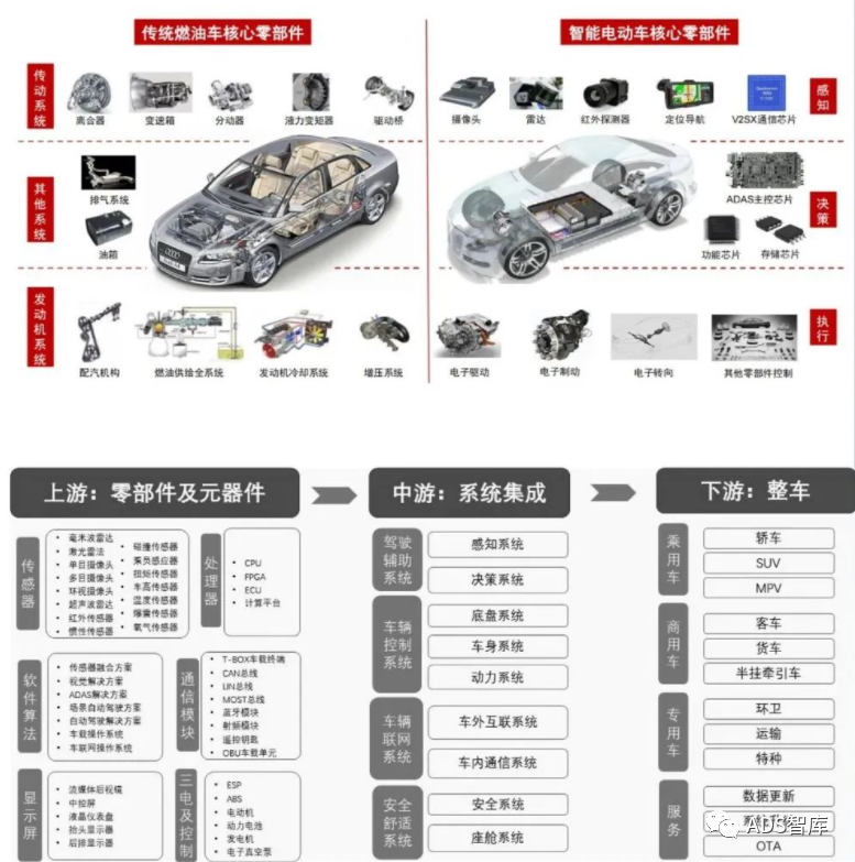 IGBT (Insulated Gate Bipolar Transistor),中文名称绝缘栅双极型晶体管,是由 BJT 和 MOSFET 组成的复合功率半导体器件,同时具备 MOSFET 开关速度高、输入阻抗高、控制功率低、驱动电路简单、开关损耗小的优点。MOSFET(Metal Oxide Semiconductor Field Effect Transistor-金属氧化物半导体场效应晶体管)是一种半导体器件,广泛用于开关目的和电子设备中电子信号的放大。SiC 是由硅(Si)和碳(C)组成的化合物半导体材料,是目前在电力电子领域发展最快的功率半导体器件之一。模拟芯片主要处理连续的声、光、电、速度等自然模拟信号的集成电路,通讯芯片主要用于总线控制、蓝牙/WiFi等方面。主要用于数据存储。DRAM、NAND Flash 是车载存储芯片主流产品。来源:汽车ECU开发