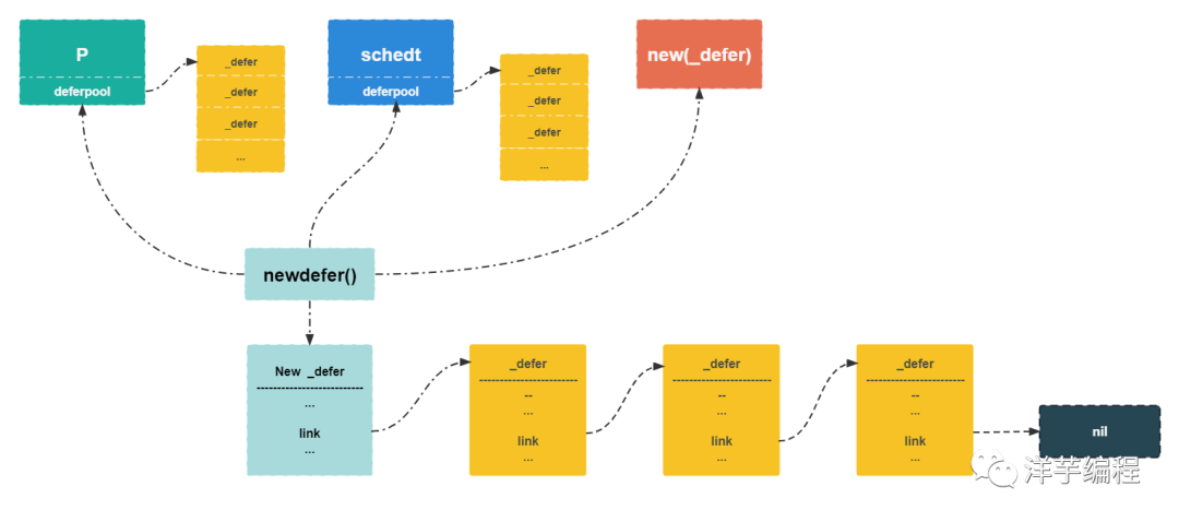 newdefer 会尽可能复用已有的 _defer 对象,优先从当前处理器 P 的 defer pool 对象池中获取,其次是调度器的 defer pool 对象池,如果这两个地方都没有获取到,就创建一个新的 _defer 对象。