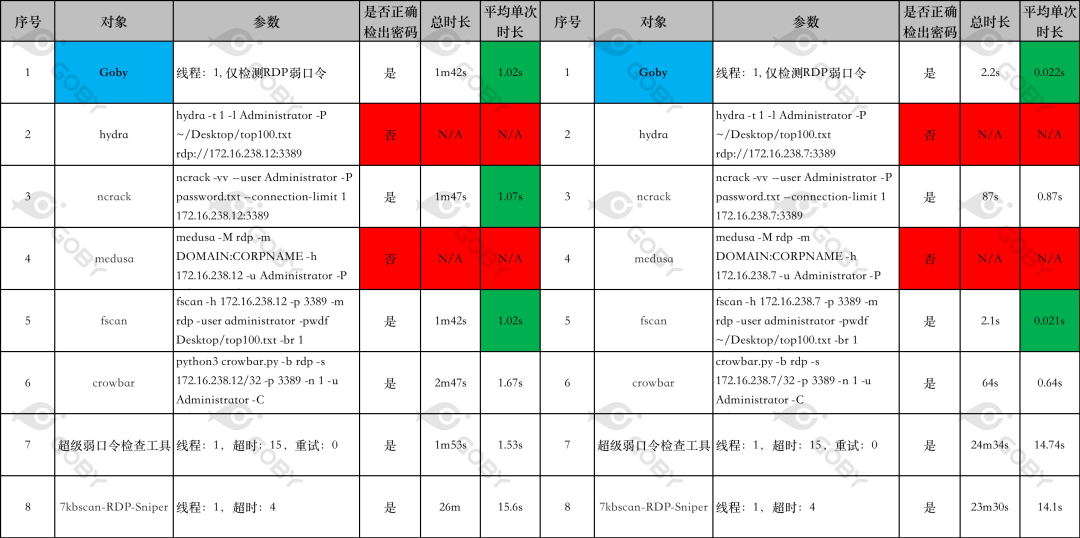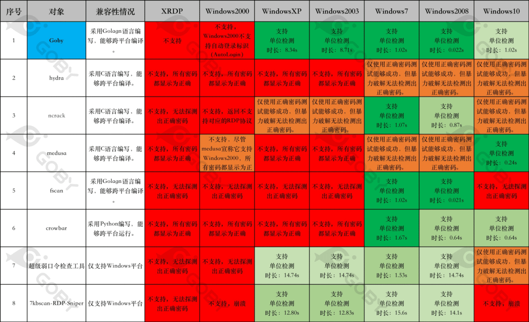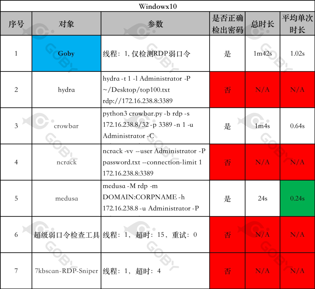 在 Windows10 下的测试结果十分令人意外,有超过一半的工具无法检测出正确的口令,这或许与 Windows10 优先选择的安全协议版本是:PROTOCOL_HYBRID_EX 有关,而在前面测试结果都非常不理想的 medusa,表现却非常出色。在 Windows10 的场景下,Goby 虽然表现并不是最优异的,但其检测速度也在可接受范围内,单次检测时长在 1s 左右。