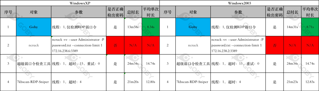 由于 WindowsXP 和 Windows2003 都是使用的 PROTOCOL_RDP 协议,需要走完全部的 RDP 协议协商流程,才能判断用户的登录状态,所以成功的工具检测时间都偏长。而 Ncrack 的表现非常差劲,虽然在直接使用正确的用户名和密码的情况下能够正确的识别,但是在暴力破解的场景下却直接卡死。
