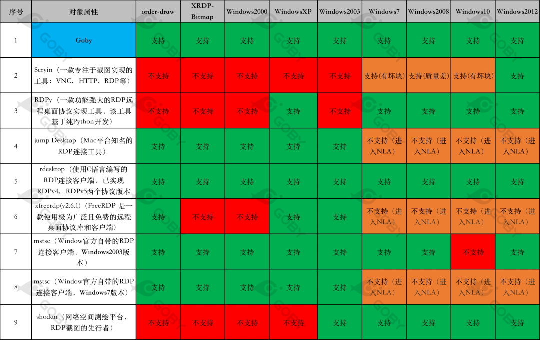 RDP(远程桌面协议)可以说是 Windows 下面使用最为广泛的协议了,RDP 之于 Windows,就跟 SSH 之于 Linux 一样,只要是做协议分析以及网络安全研究,必然绕不开 RDP。我们之前也写过相关的文章介绍,在 FOFA 平台和 Goby 产品中也都有所体现。事实上,大家聊到 RDP 除了协议信息提取之外,更多的是从两个方面来进行研究:密码爆破和截图。在 RDP 爆破领域用得比较多的是 ncrack/hydra/medusa 等,截图工具讨论比较多的是 RDPy 和 Scryin 等,但经过我们的实际测试,发现存在很多不足的地方。其结果甚至可以用惨不忍睹来形容。