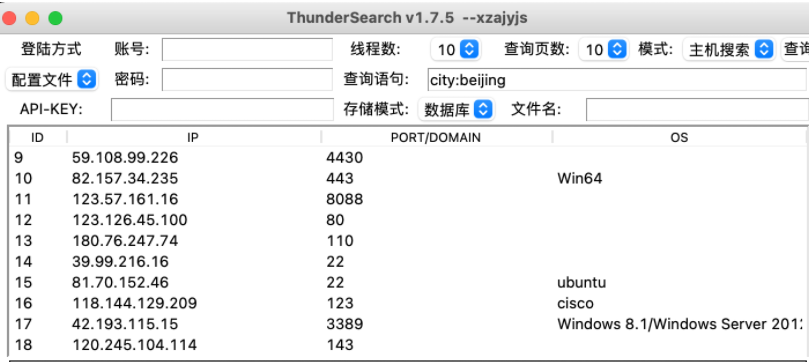 "API-KEY":"","username":"",      # zoomeye用户名(邮箱)"password":"",      # 登陆密码"db_name":"",       # 数据库名(需预先手动创建)"db_host":"",       # 数据库host"db_username":"",   # 数据库用户名"db_password":""    # 数据库密码
