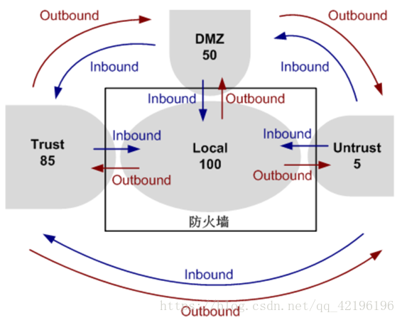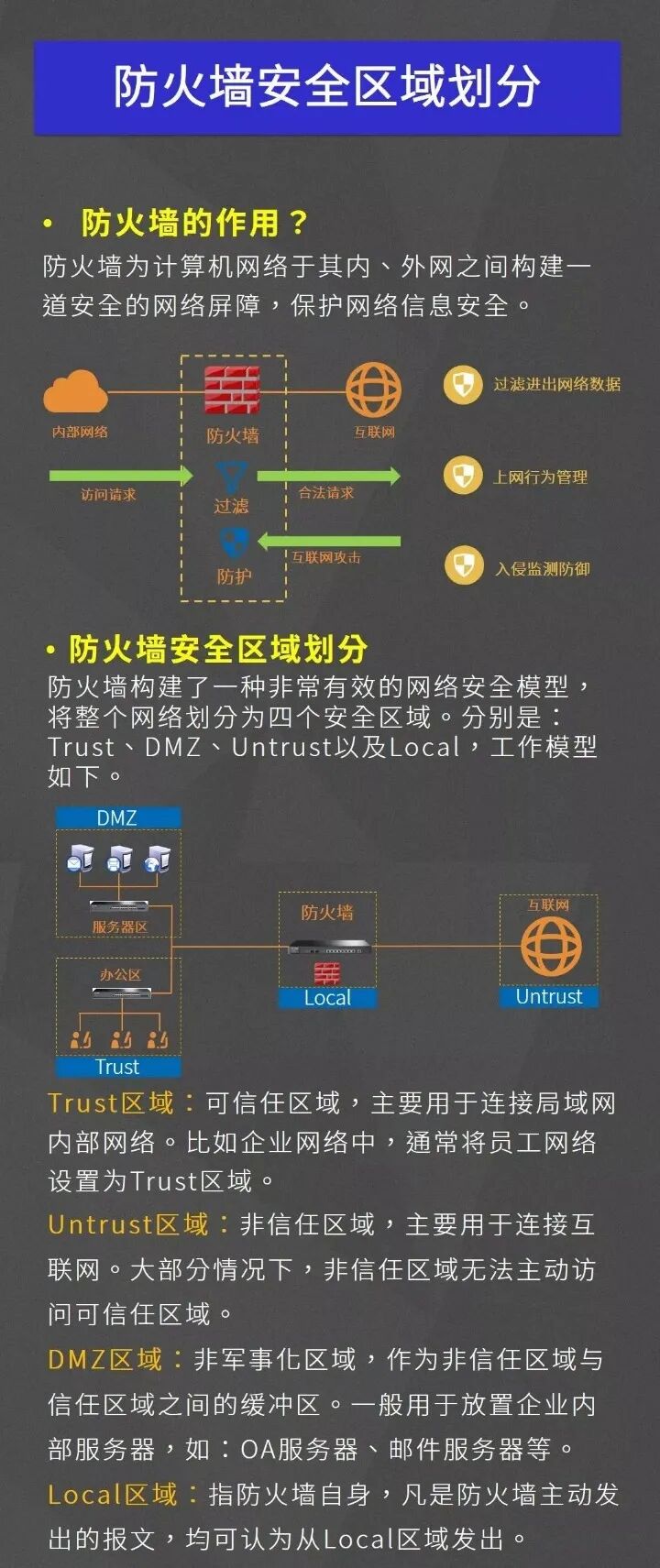 先来一张秒懂图,了解下防火墙的一些基本概念。然后讲解下防火墙的五个区域和三种模式。五个域:untrust(不信任域)dmz(隔离区)trust(信任域)local(本地)|management(管理)