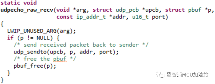在应用层一般会通过调用传输层的一些函数来编写特定的应用程序,从而实现数据的传递,在udpecho demo之中,当接收到数据之后,在udp控制块中绑定的接收回调函数中又会去调用udp_sendto函数。