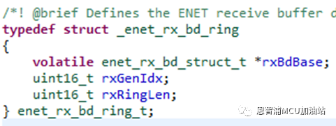 enet_rx_bd_ring_t结构体,如下图所示,每一条ring都是由buffer descriptor组成的。 Ring 结构体中的 rxBdBase 成员就是第一个 buffer descriptor 的地址, rxGenIdx 指的是当前 buffer descriptor 的序号, rxRingLen 指的是这条 Ring 中共有几个 buffer descriptor 。