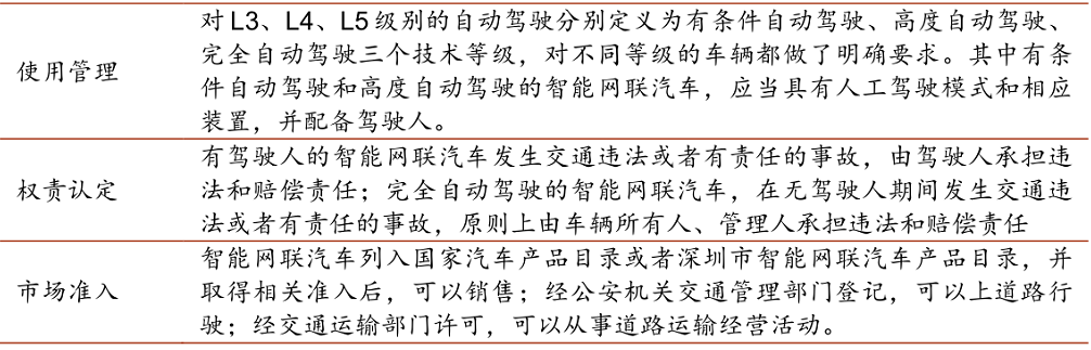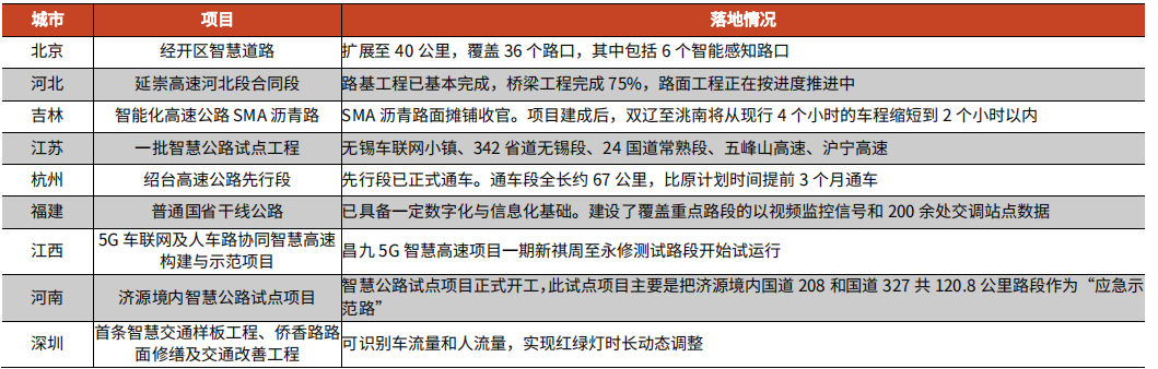 资料来源:各地方政府官网、光大证券研究所整理车路协同目前仍以政府为主要推动力,因此政策是极大的优势。2022年7月29日,住建部、国家发改委印发《“十四五”全国城市基础设施建设规划》,文件提出了“十四五”时期城市基础设施建设的主要目标、重点任务、重大行动和保障措施,以指导各地城市基础设施健康有序发展。智慧交通发展建设有望提速。(1)要分类别、分功能、分阶段、分区域推进先进的智慧道路基础设施建设。加快推进道路交通设施、视频监测设施、环卫设施、照明设施等面向车城协同的路内基础设施数字化、智能化建设和改造,实现道路交通设施的智能互联、数字化采集、管理与应用。(2)开展智慧多功能灯杆系统建设。依托城市道路照明系统,推进可综合承载多种设备和传感器的城市感知底座建设,文件预计“十四五”期间将建设4000公里以上的智能化道路,建设智慧多功能灯杆13万基以上。若单公里改造费用达百万元,“十四五”期间仅道路改造便可为新基建市场带来数十亿增量。(3)要支持国家级车联网先导区建设,逐步扩大示范区域,形成可复制、可推广的模式,开展特定区域以“车城协同”为核心的自动驾驶通勤出行、智能物流配送、智能环卫等场景的测试运行及示范应用。我们早先曾判断试点区域或由点及面,从封闭区域试点推广至半封闭区域-开放区域-区-市-省-全国范围,从而带来相关市场的快速扩容,相关产业链公司皆可受益。(4)要开展基于无人驾驶汽车的无人物流、移动零售、移动办公等新型服务业,满足多样化智能交通运输需求。开展车城协同综合场景示范应用。推进面向车城协同的道路交通等智能感知设施系统建设,构建基于5G的车城协同应用场景和产业生态。从文件表态来看,官方对行业商业模式的探索与推进持支持态度,有利于行业生态塑造及行业内公司业绩兑现。在北京市关键核心技术攻关项目“揭榜挂帅”实施方案的推动下,北京科技企业联合攻关的车路协同“大脑”即将在今年上路应用。今年8月前,50台国产自研的边缘计算节点设备将安装在北京市高级别自动驾驶示范区的智慧路杆上并完成测试,让自动驾驶车“眼观六路耳听八方”,推动车路协同自动驾驶时代早日来临。作为支持车路协同自动驾驶的核心设备,边缘计算节点(MEC)设备堪称车路协同的“大脑”。长期以来,该设备单价高达20万元,且核心部件依赖国际厂商。结合中关村新一轮先行先试改革要求,市科委、中关村管委会近期会同市发展改革委、市经信局、海淀区等10部门制定发布了《北京市关键核心技术攻关项目“揭榜挂帅”实施方案》。在边缘计算节点(MEC)设备的揭榜挂帅项目中,百度从12家积极申报的团队中成功“揭榜”,将联合浪潮、京智网进行科技攻关。“以单个路口节省15万元、规模化部署1000个路口计算,这项揭榜挂帅成果可节省成本1.5亿元。”以示范区乃至未来全北京数千数万个路口的真实需求为应用场景,此次联合攻关可以切实将科技攻关的成果产业化,并具备向其他地区推广的潜力,培育车路协同技术领域的未来产业。去年深圳市发布了《深圳经济特区智能网联汽车管理条例》。该条例是全国首个对L3及以上自动驾驶权责、定义等重要议题进行详细划分的官方管理文件。条例最大亮点在于支持了以往处在模糊领域的L3级别自动驾驶的全域通行,包括了高速、城市开放道路和泊车域,以及对商业化运营的放开;这也为全国其他地方的L3级自动驾驶准入政策,提供了标准和模板。随着L3相关法规预期落地,智能网联车渗透率将加速提升,产业链上下游将充分受益技术升级带来的需求扩容。第九届智能网联汽车技术年会上,北京市高级别自动驾驶示范区、百度Apollo、清华大学智能产业研究院等机构和企业分享出的最新实践数据,表现出了车路协同的应用潜力。首先是对于单车智能自动驾驶长尾场景的帮助,清华大学国强教授、智能产业研究院的首席研究员聂再清介绍了一个在北京市高级别自动驾驶示范区发生的实例:在右转后存在障碍物的道路上,支持车路协同的百度Apollo测试车可以自动绕过,而仿真系统里关闭车路协同功能的车,则要先停车观察才能继续走,这浪费了很多时间。对于车路协同可以在这方面发挥的具体能力,阿波罗智能技术(北京)有限公司IDG智能驾驶事业群副总裁、智能网联业务总经理刘常康表示:面对盲区鬼探头遮挡、红绿灯倒数等单车感知能力有限的场景,车路协同可以在其已减少90%安全事故的基础上,再减少90%。其次,车路协同也能有效提升通行效率。据北京车网科技发展有限公司总经理孙宁介绍,北京市高级别自动驾驶示范区基于路侧全量实时感知信息,已有27条干线可实现绿波通行,大幅降低了停车次数和通行时长。具体的效果有:绿波干线停车次数平均降低35.45%,行程时间平均降低10.24%;单点自适应路口(永昌中路路口)排队长度平均降低19.63%,绿灯浪费时间平均降低5.25%。百度Apollo的测试数据也与之接近,刘常康介绍:我们的车路协同在广州黄埔以后,发现车辆通行平均的行程时间下降25%,拥堵延误率下降30%。2022年7月12日,国家发改委印发《国家公路网规划》,规划指出:“到2035年,基本建成覆盖广泛、功能完备、集约高效、绿色智能、安全可靠的现代化高质量国家公路网。”推动智慧交通的发展,提