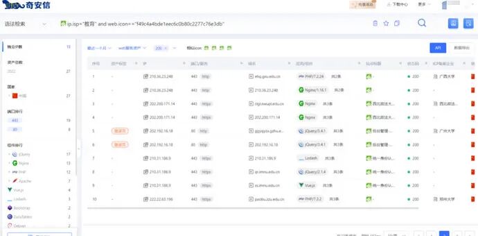 查询教育资产的语法:domain="edu.cn" 表示搜索以edu.cn为结尾的资产,ip.isp="教育",表示搜索教育网段的资产,后者的搜索规模是比前者大很多