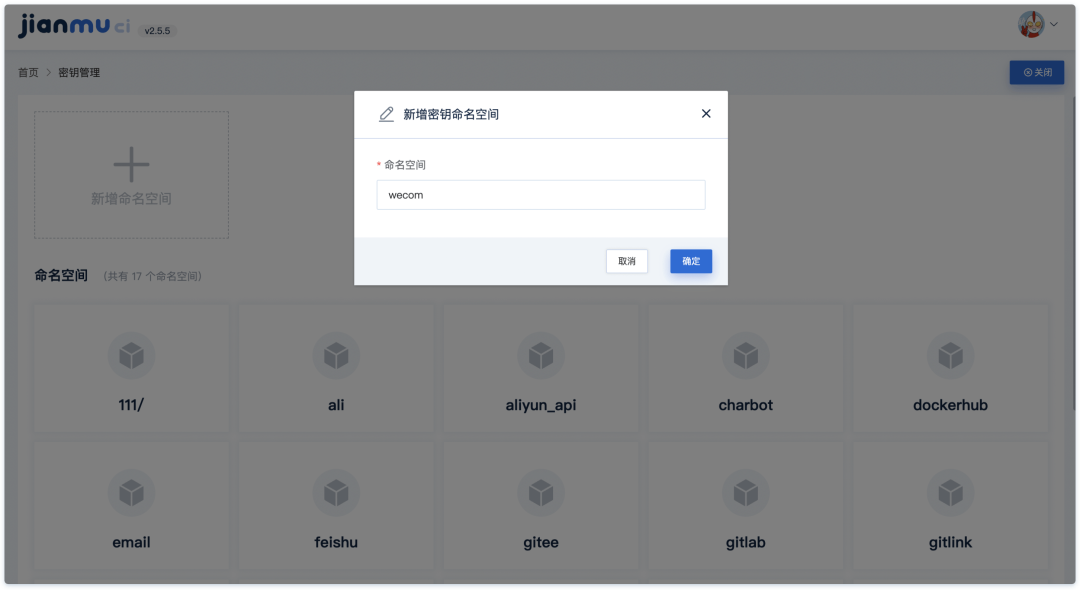 4、进入命名空间,创建密钥,填写名称和值,参考如下
