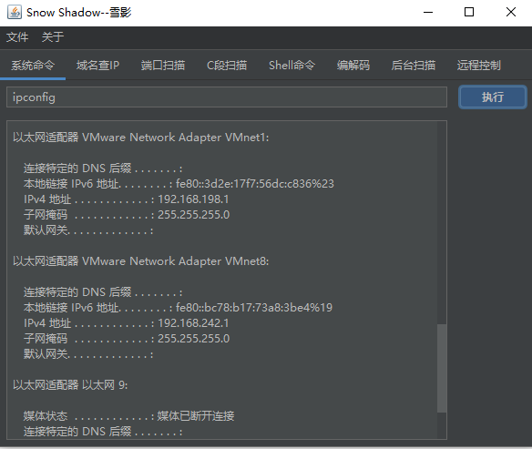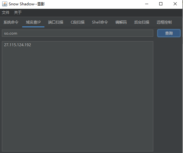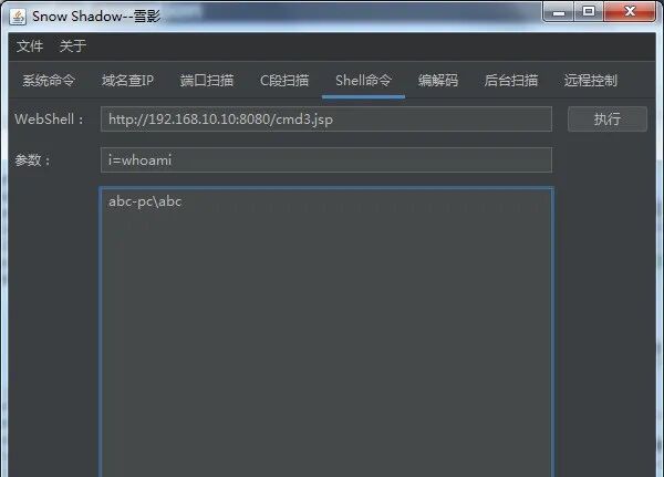 雪影,一款桌面软件,集成了IP查询,端口扫描,系统命令,Webshell,C段存活扫描,后台目录扫描,远程控制等功能,以后还会增加其它实用功能。