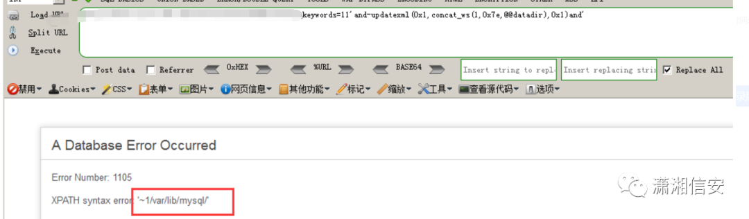 现在我们来构造报错内容,concat函数被拦截,这里使用 concat_ws()函数,将后面的参数用第一个值来分割,然后配合@@datadir输出路径