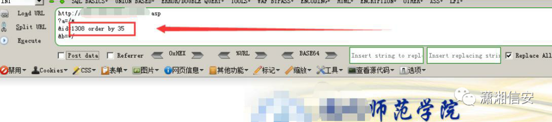 http://xxxx/xxxx.asp?a=/&id=1308%20order%20by%2035&b=/ order by 35 正常