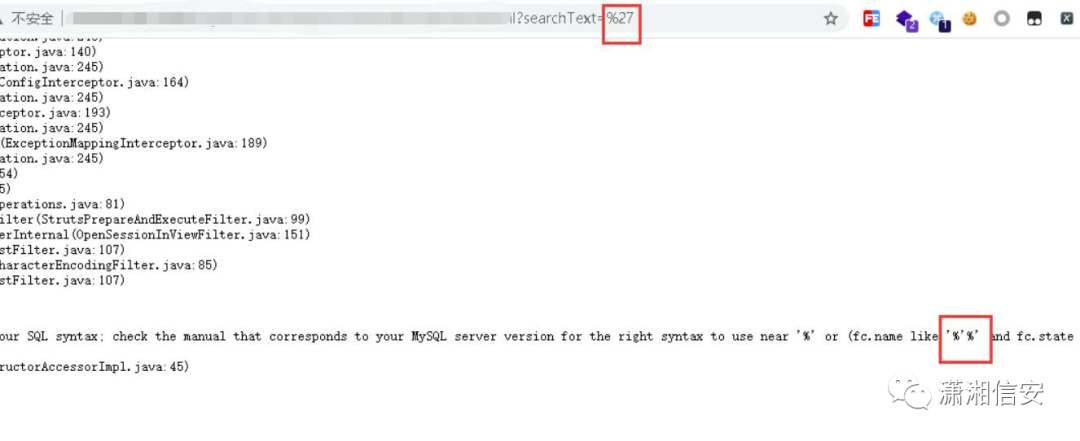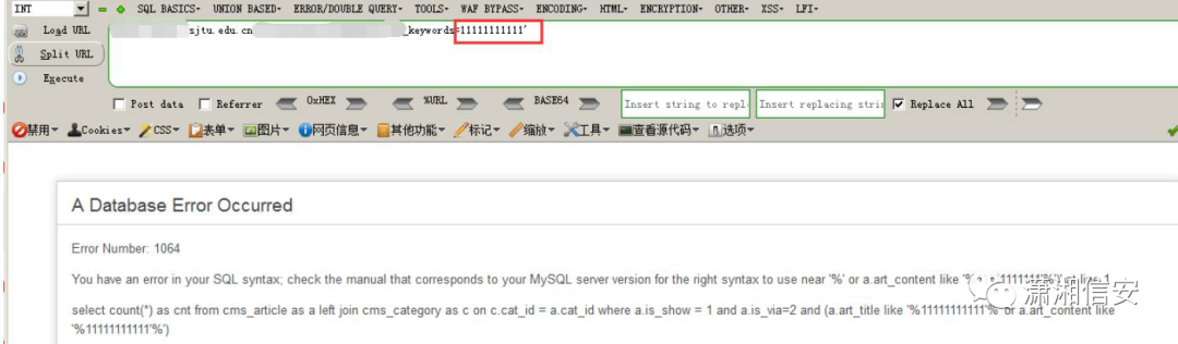 页面搜索功能尝试输入单引号,页面 500 报错并输出了报错信息