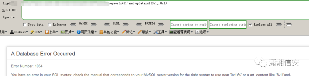 测试字符发现页面报错,使用报错注入来出数据